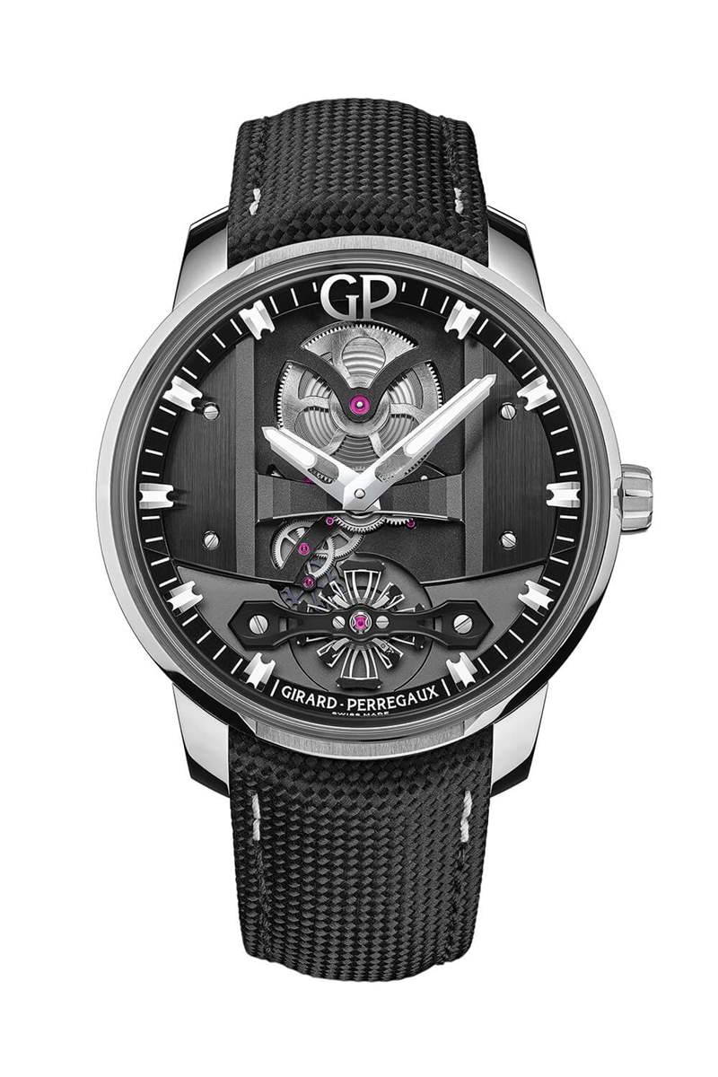 這不是經典的三座金橋。這是對 Girard-Perregaux 以橋板為基礎的癡迷的鮮明現代重新詮釋,選擇了一個光滑的開放式表盤,兩側以啞光黑色金屬制品為主,并配有可見的螺絲。中央時針和分針(這里沒有秒針)由刻面黑色橋板支撐,可以很好地捕捉光線。