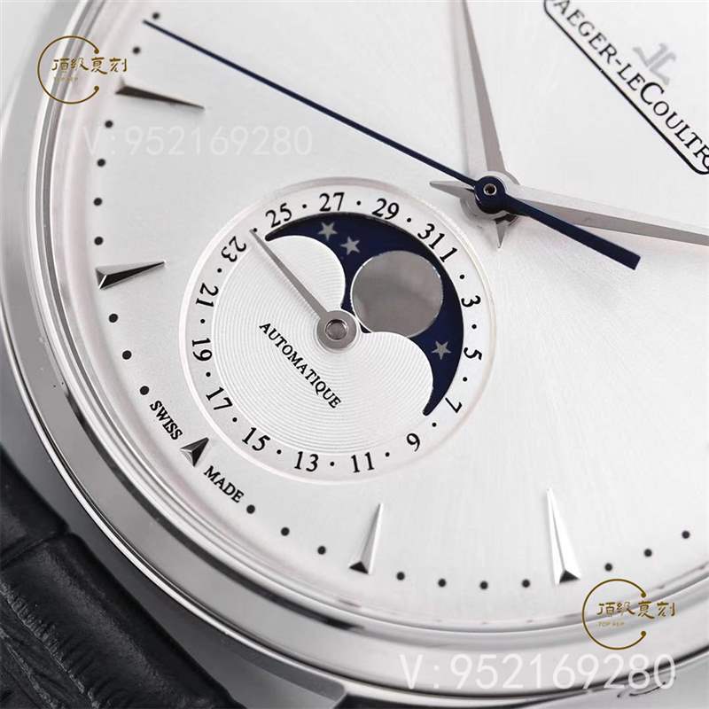 GF廠積家月相大師系列「1368430」復(fù)刻腕簡(jiǎn)約耐看銀白色的表盤,更能體現(xiàn)男士的高雅與大方?,很好的展現(xiàn)男人老到干練的一面??此坪?jiǎn)略的立體鑲嵌時(shí)標(biāo),每一枚鑲嵌時(shí)標(biāo)都要打磨出勻稱的三個(gè)平面,不只美觀大方,而且指示清楚!