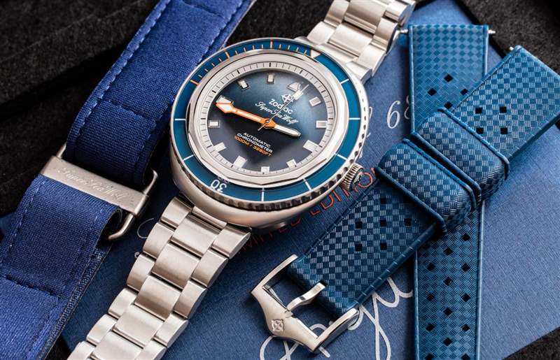 這個(gè)版本的 Zodiac Super Sea Wolf 68 Saturation 手表似乎始于一張現(xiàn)在流行的水下照片,安迪曼在巴哈馬附近拍攝了一條鯊魚(yú)。該照片的打印件包含在手表隨附的套件中,以及一些受歡迎的額外表帶。除了獨(dú)特的藍(lán)色漸變表盤(pán)外,這款腕表還設(shè)有一個(gè) 12 點(diǎn)鐘位置的時(shí)標(biāo),這是該表款的獨(dú)特之處,旨在看起來(lái)像鯊魚(yú)的背鰭。廣告訊息廣告信息結(jié)束