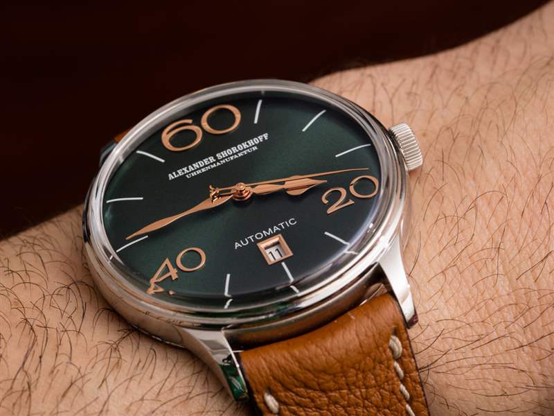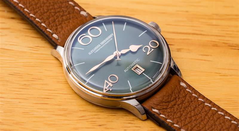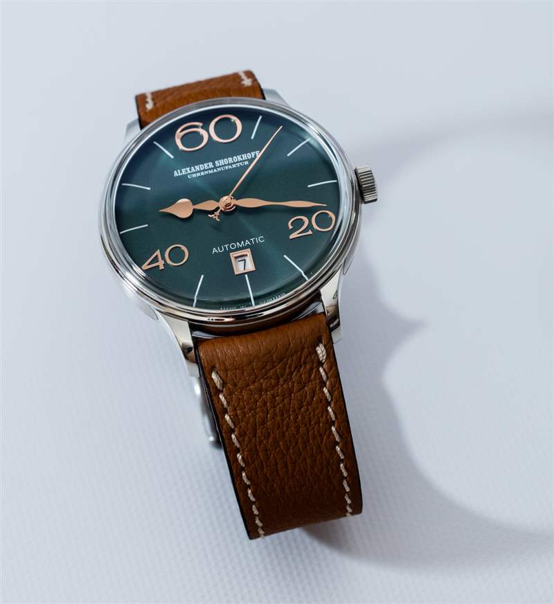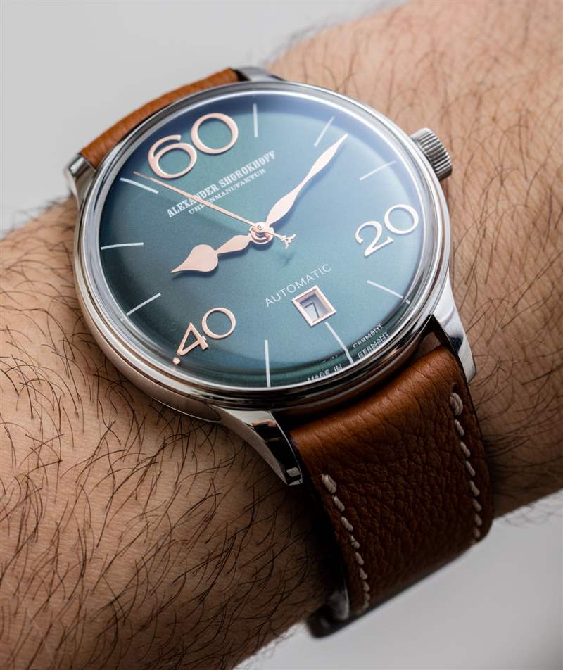 Alexander Shorokhoff 為 Model 63 提供四種表盤顏色,包括圖中的“翡翠綠”、“午夜藍、深黑”和“波爾多”。據(jù)我估計,這些顏色中的每一種在搭配盡可能接近表盤顏色的表帶時都會看起來最好,盡管添加黑色或棕色表帶顯然是最保守的選擇。再說一次,我不確定 Alexander Shorokhoff 作為一個品牌是否適合保守的鐘表佩戴者。