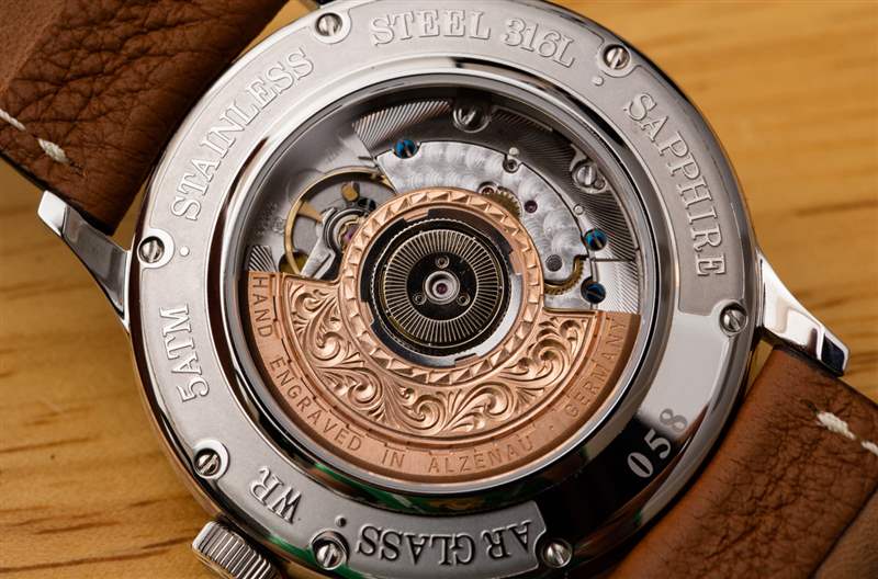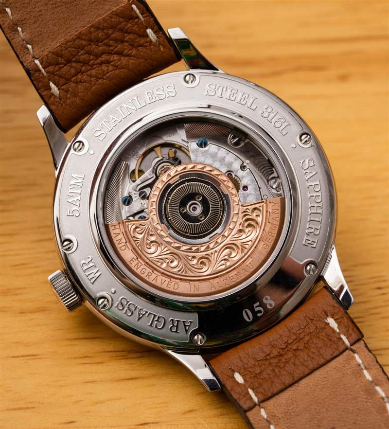 在手表內(nèi)部,通過手表背面的藍寶石水晶可以看到瑞士 ETA 2892-2 自動機芯。Alexander Shorokhoff 稱其為 2892.AS 機芯,因為增加了定制的自動轉(zhuǎn)子。從展示的角度來看,這款手工雕刻的黃銅轉(zhuǎn)子令人印象深刻。Alexander Shorokhoff 明確指出這確實是一個手工雕刻的轉(zhuǎn)子,而不僅僅是一個經(jīng)過加工或以其他方式制造(例如沖壓)的具有這種外觀的轉(zhuǎn)子。轉(zhuǎn)子本身上寫著“Hand Engraved In Alzenau, Germany”。