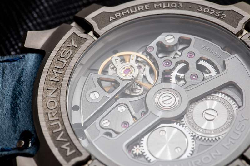 Armure MU03 手表內(nèi)??部是一個非常好看的“制造”自動機芯。此機芯并非由 Mauron Musy 自己生產(chǎn),而是由當(dāng)?shù)厝鹗抗?yīng)商為該品牌生產(chǎn)的原創(chuàng)機芯。該機芯以 4 赫茲的頻率運行,具有 55 小時的動力儲備,并提供帶有輔助秒針、日期的時間,當(dāng)然,它是自動的。有趣的細節(jié)包括雙向上鏈系統(tǒng)(不常見)以及迷人的結(jié)構(gòu)和機芯的精加工,它們在匹配 Armure MU03 手表本身的整體美感和主題方面做得很好。甚至像日期盤這樣的元素也是定制的。手表的這種“定制”水平是對有助于解釋價格點的細節(jié)的關(guān)注,作為 10 美元手表的消費者,