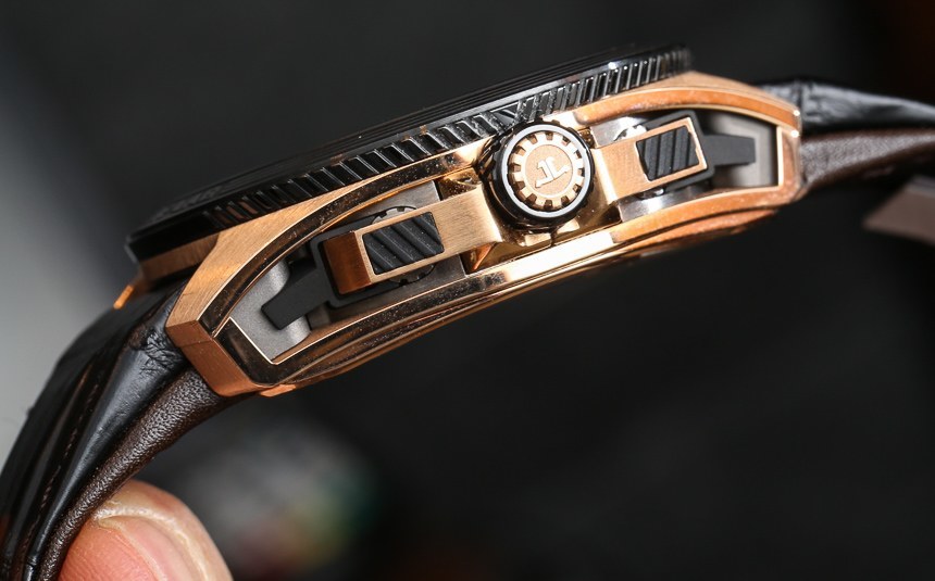 Extreme Lab 2 外殼高 16.5 毫米,肯定不薄,但它本來(lái)可以厚得多。積家 (Jaeger-LeCoultre) 設(shè)法擠出 100 米的防水性能,即使底蓋上的非圓形藍(lán)寶石水晶顯示了機(jī)芯的視圖——以及所有按鈕。表殼周圍是一個(gè)按鈕式表冠(它像按鈕一樣推入以選擇功能而不是被拉出),兩個(gè)計(jì)時(shí)碼表按鈕和一個(gè)位于表殼左側(cè)的滑動(dòng)桿。這導(dǎo)致了一些值得注意的有趣的功能選項(xiàng)。