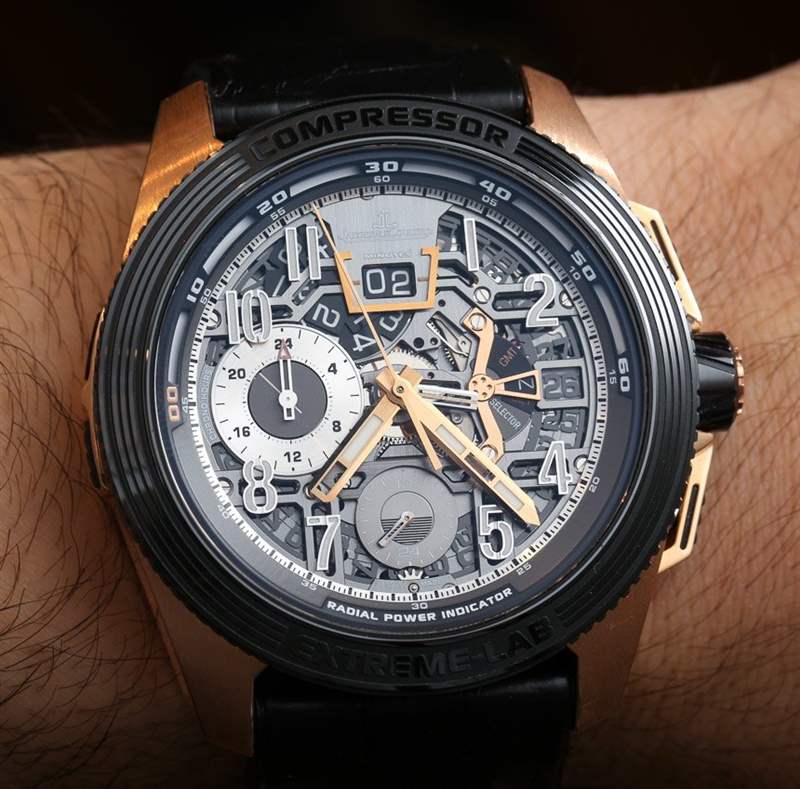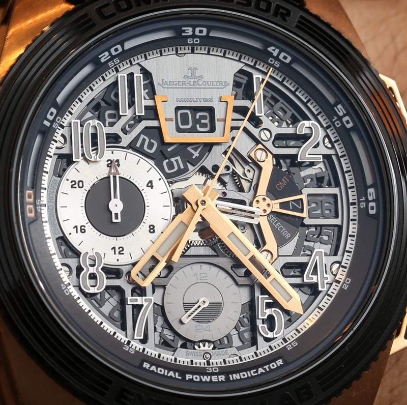 位于時(shí)針和分針旁邊的是一根附加指針,用作第二時(shí)區(qū)。它不是真正的 GMT 指針,因?yàn)樗?12 小時(shí)格式指示時(shí)間,但它在 6 點(diǎn)正上方確實(shí)有一個(gè)專用的 24 小時(shí)表盤,用于指示第二時(shí)區(qū)是上午時(shí)間還是下午時(shí)間. 靠近 3 點(diǎn)鐘的位置是一個(gè)日期窗口,緊靠日期窗口的左側(cè)是表冠操作的功能選擇器(當(dāng)您按下表冠時(shí),它會(huì)循環(huán))。最后,Jaeger-LeCoultre Extreme Lab 2 具有動(dòng)力儲(chǔ)存指示器。在其他一些手表中復(fù)制時(shí),Jaeger-LeCoultre 使用 Master Compressor Extreme Lab 2 首次推出其“徑向功率指示器”,當(dāng)動(dòng)力儲(chǔ)存從“00”到整整60小時(shí)。