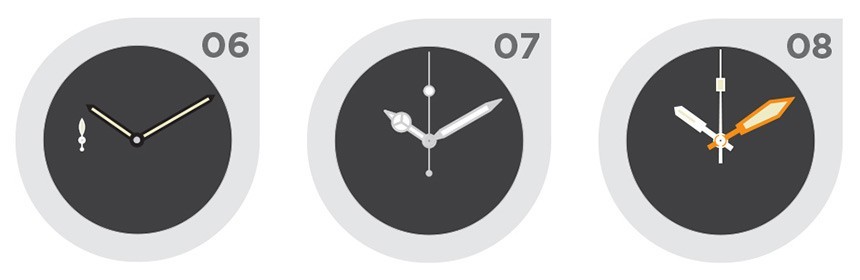 我們只看到這些您看不到的每個表盤上的指針,我們注意到了什么?在大多數(shù)情況下,手的大小和比例都合適。這意味著它們在表盤上盡可能地延伸,分針與時針不同或易于識別。因此,重要的不僅僅是手,還有它們之間的相對設(shè)計。
