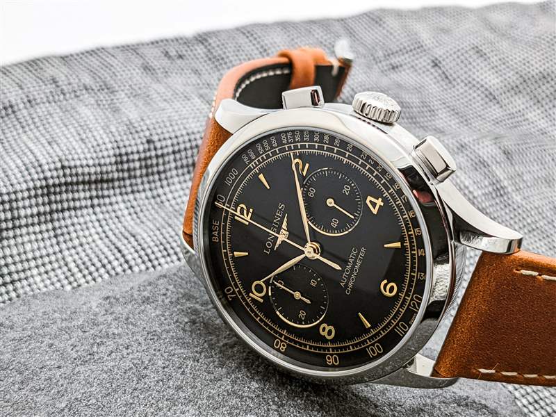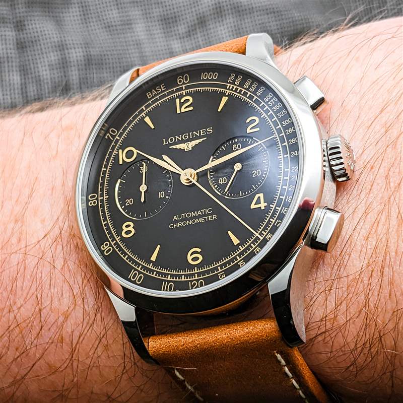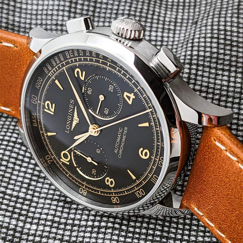 與安靜成長(zhǎng)的 30 年代/40 年代計(jì)時(shí)碼表領(lǐng)域中的大多數(shù)競(jìng)爭(zhēng)對(duì)手相比,浪琴表 Record Heritage 提供了非常干凈和內(nèi)斂的表盤設(shè)計(jì)。浪琴 (Longines) 對(duì)復(fù)古風(fēng)格的啞光黑色表盤并不陌生,Record Heritage 表盤光滑、均勻的飾面賦予其干凈、經(jīng)典的外觀,而不會(huì)給人以古銅色的印象。話雖如此,由于其小表盤刻度、徽標(biāo)以及測(cè)速計(jì)刻度和計(jì)時(shí)碼表秒軌道的雙外圈的鍍金表盤文字,表盤仍然提供了充足的視覺溫暖。在保持 40 年代的設(shè)計(jì)感及其迷人的視覺復(fù)雜性的同時(shí),這些外部刻度還將表盤設(shè)計(jì)的其余部分壓縮到更小的區(qū)域,進(jìn)一步增強(qiáng)手腕上的緊湊感。然而,真正吸引眼球的是金色表盤硬件。實(shí)用的阿拉伯?dāng)?shù)字和楔形索引的組合明亮而迷人的老式風(fēng)格,優(yōu)雅纖薄的葉子手機(jī)也是如此。雙凹陷子表盤周圍的金色裝飾環(huán)讓 Record Heritage 在手腕上看起來(lái)更加閃亮,同時(shí)自然地將眼睛吸引到那里的關(guān)鍵信息。Longines 選擇用 azurage 完成這些子表盤,讓大部分啞光設(shè)計(jì)在不斷變化的光線下也有一點(diǎn)活力。盡管整體布局優(yōu)雅、精致且視覺平衡令人印象深刻,但 Record Heritage 的易讀性可能是愛好者爭(zhēng)論的焦點(diǎn)。精美印刷的計(jì)時(shí)秒針刻度,葉子聽筒的纖細(xì)尖端,