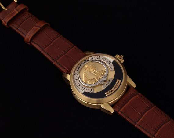 托馬斯被要求在他的設(shè)計(jì)中更具區(qū)域性。不知道他為什么選擇卡塔爾,但這激發(fā)了他以國家為主題作為設(shè)計(jì),以他最好的品質(zhì)創(chuàng)作限量版系列。Tempusvivendi系列使用兩個(gè)相鄰的逆跳刻度來顯示小時(shí)和分鐘。在這里,表盤的設(shè)計(jì)基于卡塔爾的徽章 – 您可以在這里看到。托馬斯能夠使這兩把劍成為逆跳刻度的時(shí)針和分針。也許是徽章的便捷布局導(dǎo)致他將卡塔爾作為新手表的基礎(chǔ)?!