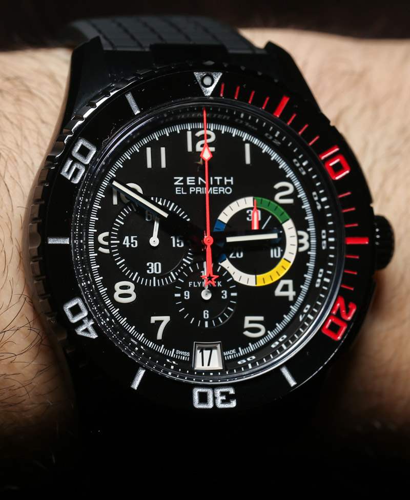 2010 年,真力時(shí)發(fā)布了帶有黑色和紋理銀色表盤的 El Primero Defy Rainbow。在我看來,這個(gè)版本的 Rainbow 是 Nataf 年代最好看的外觀之一。它比 Stratos 版本(寬度超過 45 毫米)更大,寬度為 46.5 毫米,并且是唯一一款在表盤上真正寫著“彩虹”字樣的 Rainbow。當(dāng)時(shí)這些產(chǎn)品銷量不佳,生產(chǎn)時(shí)間也很短。如果你能找到一個(gè)——尤其是黑色表盤——我建議你把它撿起來。它非常有收藏家物品的制作材料。Defy Rainbow 沒有使用 405 機(jī)芯,而是使用了一種叫做 El Primero 400FC 的東西。我不知道有什么區(qū)別,因?yàn)樗兴邢嗤牟l(fā)癥。更新:根據(jù) Zenith 的說法,El Primero 400FC 有點(diǎn)獨(dú)特,因?yàn)樗褂昧恕癦enithium”金屬擺輪橋板(整個(gè) Defy 系列都這樣做),這是一種鋁、鈦和鈮合金。它的目的是吸收一些有助于準(zhǔn)確性和壽命的沖擊。有趣的!它還恰好具有 300 米防水功能,并激發(fā)了計(jì)時(shí)秒針上真力時(shí)星形配重錘的誕生。您會(huì)注意到 Stratos Rainbow 使用與 2010 Defy Rainbow 完全相同的秒針。