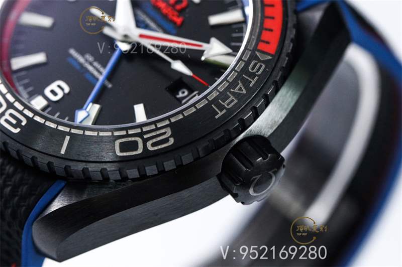 VS廠歐米茄深海之黑新西蘭酋長隊(duì)紅藍(lán)復(fù)刻版表殼由黑色陶瓷精制而成,并采用陶瓷表圈。陶瓷表圈的潛水刻度由Liquidmetal?技術(shù)打造,以新西蘭國旗配色為靈感,將紅色和藍(lán)色的橡膠材質(zhì)應(yīng)用于表圈前10分鐘的刻度,而最后5分鐘則由Liquidmetal?技術(shù)打造的“START” (開始) 字樣呈現(xiàn)。表圈12點(diǎn)處的圓點(diǎn)則覆以Super-LumiNova夜光涂層,在黑夜中散發(fā)出綠色的迷人光澤。垂直打磨的黑色陶瓷表盤配有白色18K金小時(shí)刻度以及GMT表圈,令晝夜顯示分明。