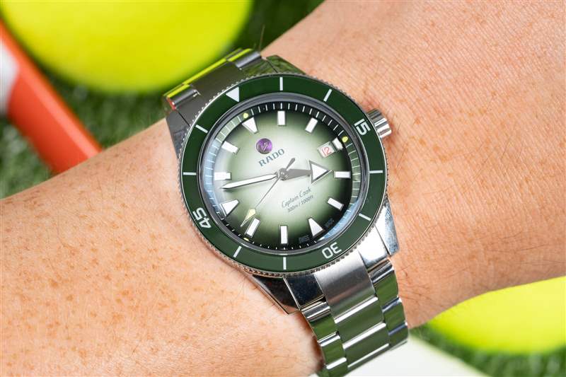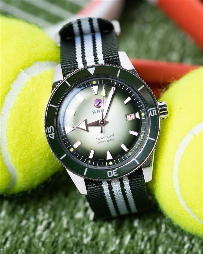 卡梅倫·諾里 (Cameron Norrie) 庫克船長 (Captain Cook) 的表盤是這一切的集大成者。這就是 Norrie 和 Rado 享受樂趣的地方。您擁有標準的大箭頭時針(加上網(wǎng)球黃色秒針尖端)和所有庫克船長腕表上都有的應用標記,以及相同的表盤文字和精美的紅色文字日期輪。這一切都很棒,您不會聽到我對 Super-LumiNova 的易讀性和亮度提出任何抱怨。Norrie 版本將北約 (NATO) 的白色和綠色圖案與表圈融為一體,引入了從白到綠的漸變,最終形成深綠色的章環(huán)。