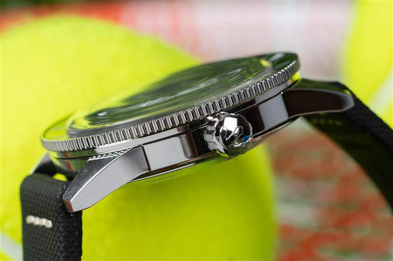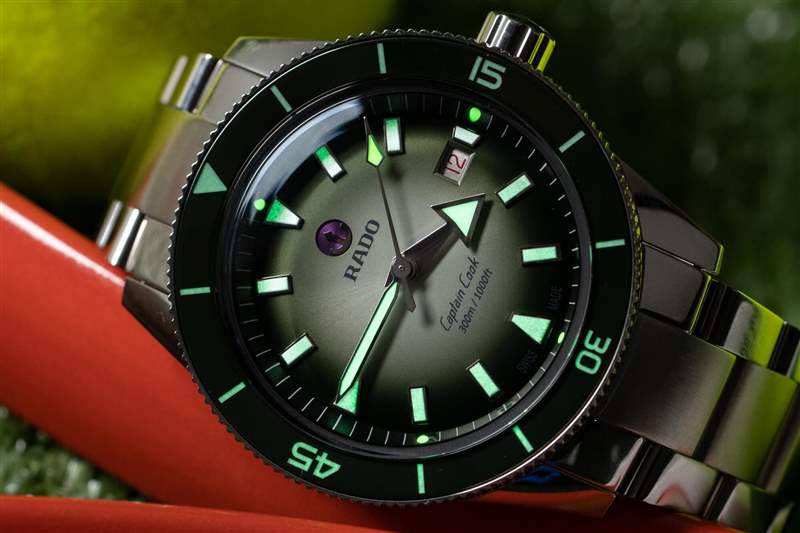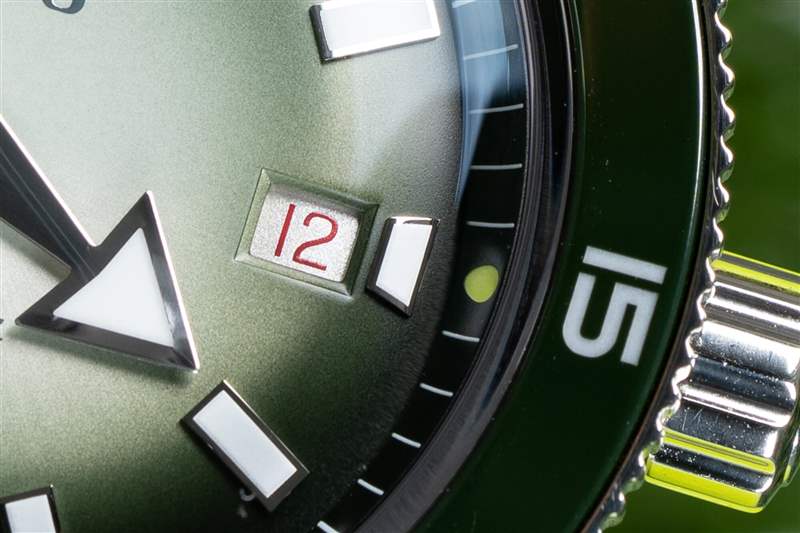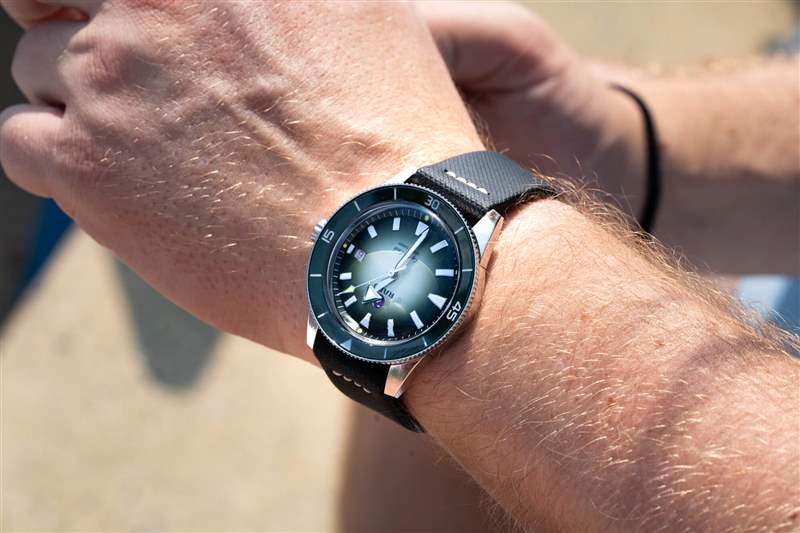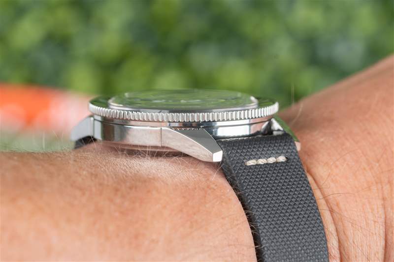 庫克船長系列的標志是其體育場表圈。硬幣邊緣經過完全拋光,綠色陶瓷嵌件也是如此,其上刻有 Super-LumiNova 填充標記。與扁平邊框類似,但外觀更酷,這種風格最大化了握持面積,同時最小化了高度,而更常見的凸形邊框通常會導致更高的高度或更少的握持力??梢钥隙ǖ氖牵穫愔Z里庫克船長通過了我嚴格的表圈測試:當我的手和表圈都是濕的時(在我兒子洗澡時和在海里時),我能夠旋轉它。高度的比例優(yōu)勢也很明顯,腕表厚度為 12.3 毫米,佩戴起來非常舒適,尤其是對于 42 毫米、300 m WR 腕表而言。雖然它不是瑞士 300m 跳水運動員中最瘦的,但它擊敗了歐米茄海馬和勞力士潛航者,前者的表圈在潮濕時毫無用處。