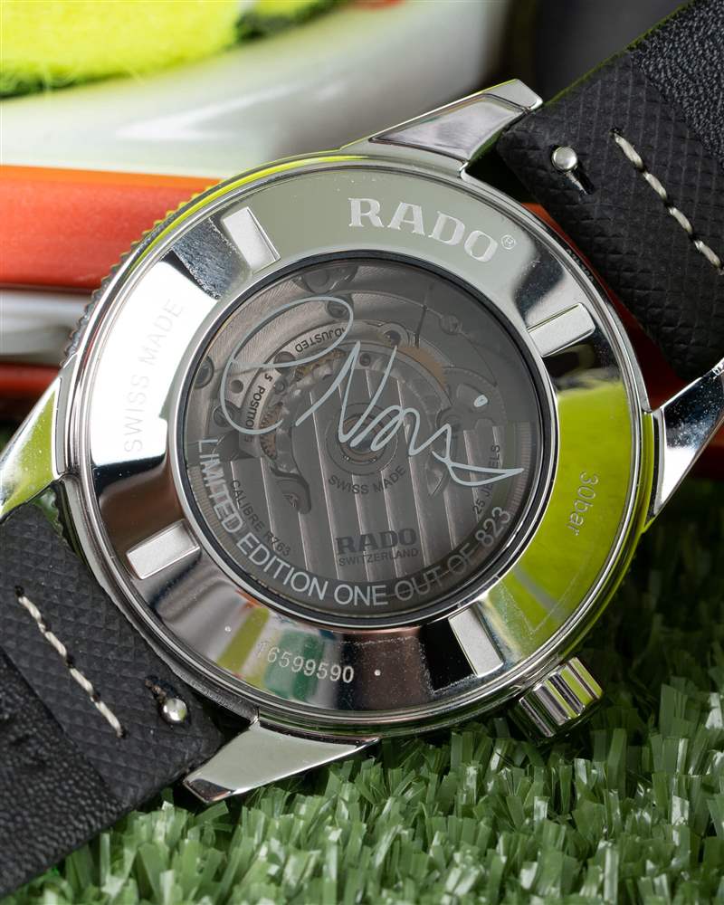 作為限量版,該腕表配備煙熏藍寶石水晶表底蓋,底蓋上印有 Cameron Norrie 的簽名和金屬印花的限量版文字——該腕表限量發(fā)行 823 枚,以紀念 Norrie 的 8 月 23 日生日。印刷是這樣的,只有在光線照射下你才能看到清晰的視野,我更喜歡不那么神秘的“永遠在線”的替代方案。透過表背,您可以看到基于 ETA C07.611 的 Rado R8763 自動機芯。這款機芯在斯沃琪集團旗下的其他地方也有使用,例如 Midos 的 Calibre 80 和 Hamiltons 的 H-10。實際上,它是一款已降頻至 21,600 vph 的 ETA 2824-2,可提供 80 小時的動力儲存。在我坐下來寫這篇文章的那天,我在離開幾天后拿起手表戴上,并驚喜地發(fā)現(xiàn)它仍然準時運行。