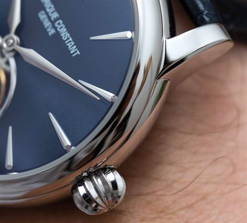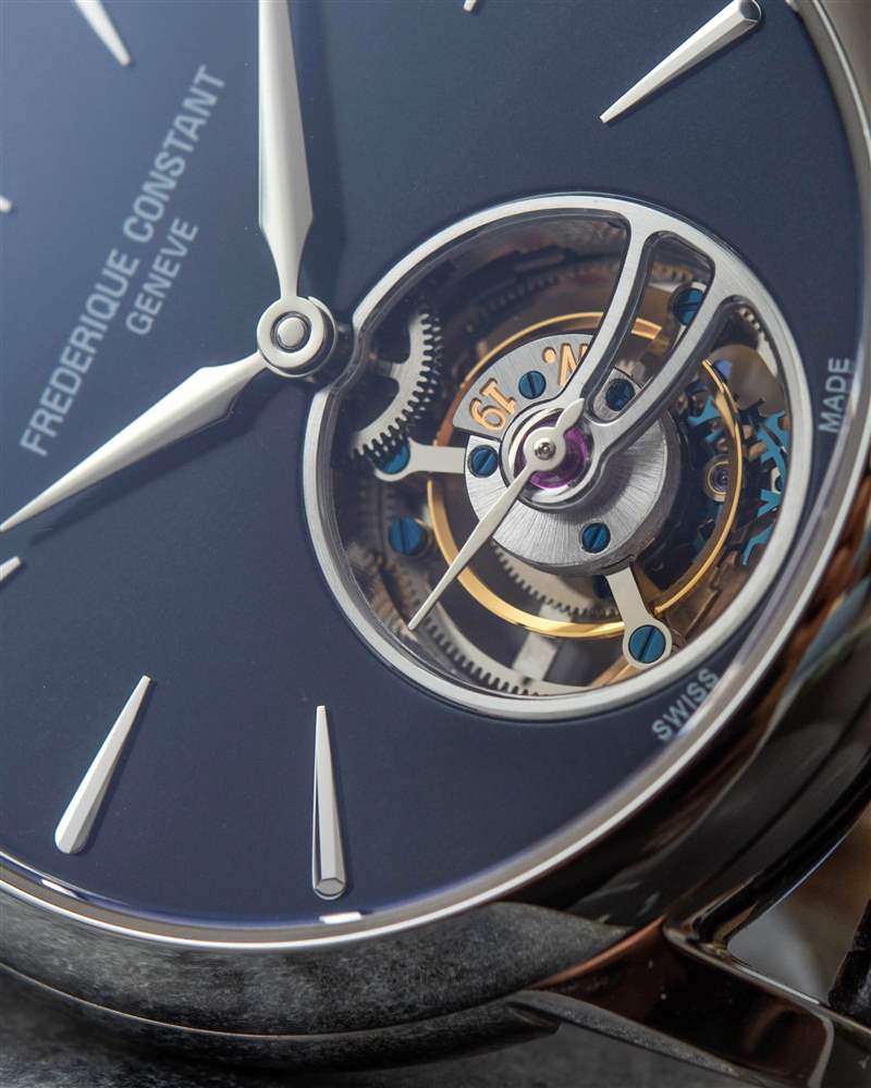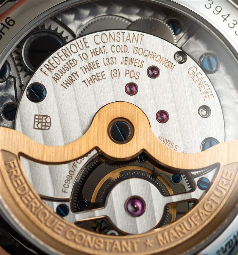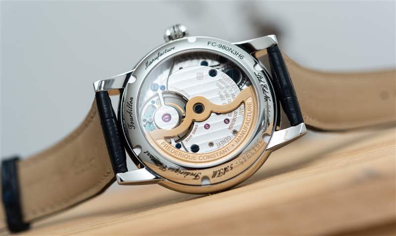 巨大的指針以其體積、復(fù)雜的形狀和明顯的縱向彎曲給人留下了深刻的印象。它們也是 FC-980 自產(chǎn)機(jī)芯的力量展示,該機(jī)芯不僅承載著巨大的時針和分針,還承載著陀飛輪組件。動力儲存只有區(qū)區(qū)38小時,很短,但至少是自動補(bǔ)充的。FC-980機(jī)芯調(diào)校為熱、冷、等時、三方位,但沒有說明是否是經(jīng)過認(rèn)證的天文臺表。