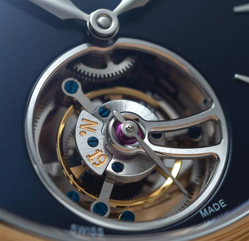 它擁有瘋狂移動的擺輪——拋光的金色色調(diào),帶有陡峭的倒角,觸感非常好——其快速擺動幾乎無法辨認(rèn),而三臂框架則跟隨每一次滴答聲并以彈性的方式滑動。優(yōu)雅時尚,60 秒畫一圈。這些同軸運(yùn)動確實很巧妙,有一個小擒縱輪在周圍運(yùn)轉(zhuǎn),就好像它著了魔一樣。從上方固定陀飛輪組件的框架和鏤空夾板(如果它的兩端固定在機(jī)芯上,則可以稱為夾板)經(jīng)過精心打磨,邊緣經(jīng)過斜角和拋光處理,甚至在最深處還為大顆寶石設(shè)計了拋光埋頭孔。中心。它是秩序、平衡和機(jī)械美的縮影。