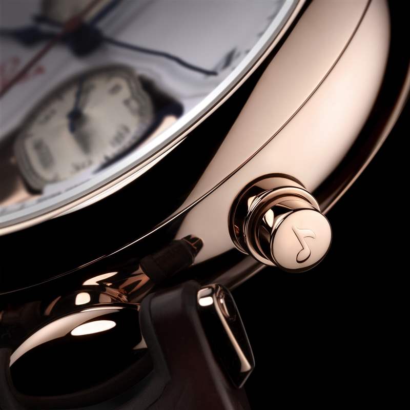 根據(jù)品牌提供的視頻資料,這款被稱為具備「計時鳴報」(Chrono Chime)功能的機芯能夠清亮地鳴報出計時時間信息,與人們習(xí)慣已久的普通三問表報時方式很不相同——音槌首先敲擊低音簧鳴報分鐘,然后2個音槌共同敲擊出雙音代表10秒鐘,最后高音錘敲擊報出個位秒鐘。機芯橋板、夾板、音簧等部件均由Sedna 金制成,令報時鳴音更為清脆悅耳。