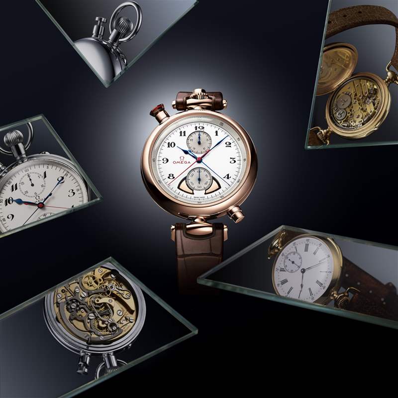 打開品牌官網(wǎng),直接呈現(xiàn)出那一組 Olympic 1932 Chrono Chime 的圖片:老式懷表的表殼表耳結(jié)構(gòu),白色琺瑯盤面,藍(lán)鋼指針,黑色時標(biāo),925銀內(nèi)表圈和小表盤,搭配偏紅的18K Sedna 金怎么看都像是加上了腕表表耳的懷表。事實上,歐米茄對于該表的設(shè)計參考了品牌為1932年洛杉磯奧運會制作的經(jīng)典計時表,酷似懷表之余也確實為它設(shè)計了兩套皮質(zhì)掛繩,使之可以秒變懷表。端詳良久,滿目的親切感,這不是懷表時代不算少見的計時加問表功能疊加的高端古董計時表的再現(xiàn)嗎?