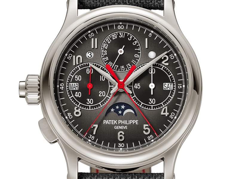 低調(diào)的炭灰色表盤經(jīng)過緞面拉絲處理,時(shí)分針和時(shí)標(biāo)均為白金材質(zhì),三枚計(jì)時(shí)功能指針則采用醒目的紅色。表盤布局同樣煥然一新——12點(diǎn)為日歷盤,1點(diǎn)是晝夜指示窗,3點(diǎn)是小秒針和星期窗,月相盤位于6點(diǎn),9點(diǎn)是60分鐘計(jì)時(shí)盤和月份窗,11點(diǎn)的小圓窗提示閏年。