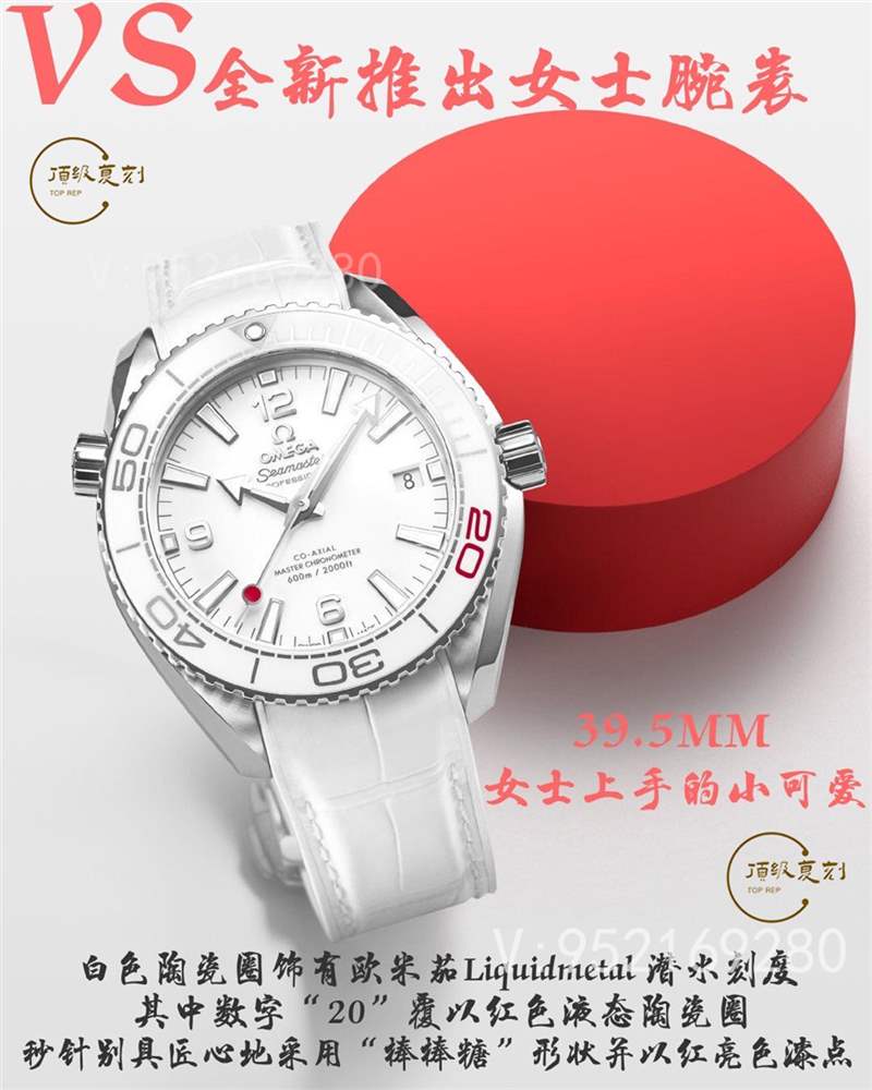 VS廠全新推出女士腕表-歐米茄海洋宇宙600米,39.5mm表殼。白色陶瓷表圈飾有歐米茄Liquidmetal潛水刻度,其中數(shù)字20覆以紅色液態(tài)陶瓷,秒針別具匠心地采用”棒棒糖”形狀,并以紅色亮漆點綴,女士手上的小可愛。VS出品,不用擔(dān)心丟頭粒等質(zhì)量問題。 舒心戴。
